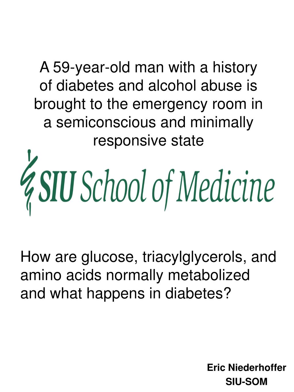 A 59-year-old man with a history of diabetes and alcohol abuse is brought to the emergency room in a semiconscious and minimally responsive state How are glucose, triacylglycerols, and amino acids normally metabolized and what happens in diabetes? Eric Niederhoffer SIU-SOM