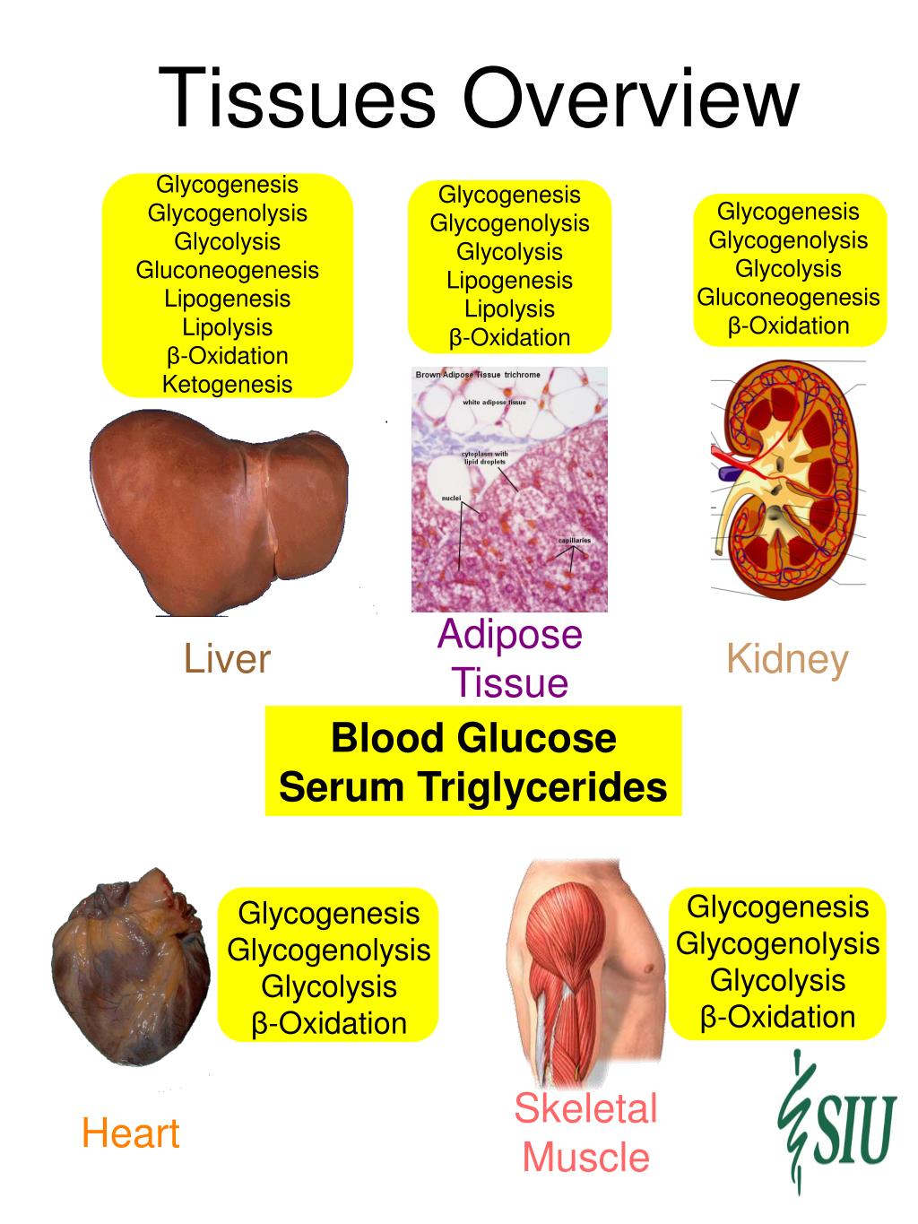 Tissues Overview Glycogenesis Glycogenolysis Glycolysis Gluconeogenesis Lipogenesis Lipolysis β-Oxidation Ketogenesis Glycogenesis Glycogenolysis Glycolysis Lipogenesis Lipolysis β-Oxidation Glycogenesis Glycogenolysis Glycolysis Gluconeogenesis β-Oxidation Adipose Tissue Liver Kidney Blood Glucose Serum Triglycerides Glycogenesis Glycogenolysis Glycolysis β-Oxidation Glycogenesis Glycogenolysis Glycolysis β-Oxidation Skeletal Muscle Heart