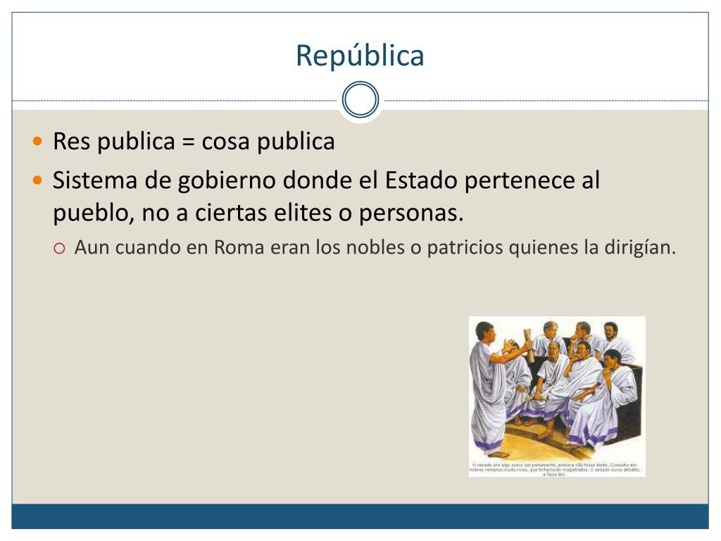 República • Res publica = cosa publica • Sistema de gobierno donde el Estado pertenece al pueblo, no a ciertas elites o personas. • Aun cuando en Roma eran los nobles o patricios quienes la dirigían.