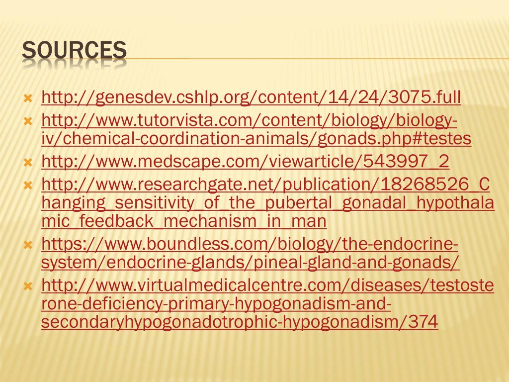 http://genesdev.cshlp.org/content/14/24/3075.full http://www.tutorvista.com/content/biology/biology-iv/chemical-coordination-animals/gonads.php#testes http://www.medscape.com/viewarticle/543997_2 http://www.researchgate.net/publication/18268526_Changing_sensitivity_of_the_pubertal_gonadal_hypothalamic_feedback_mechanism_in_man https://www.boundless.com/biology/the-endocrine-system/endocrine-glands/pineal-gland-and-gonads/ http://www.virtualmedicalcentre.com/diseases/testosterone-deficiency-primary-hypogonadism-and-secondaryhypogonadotrophic-hypogonadism/374 Sources