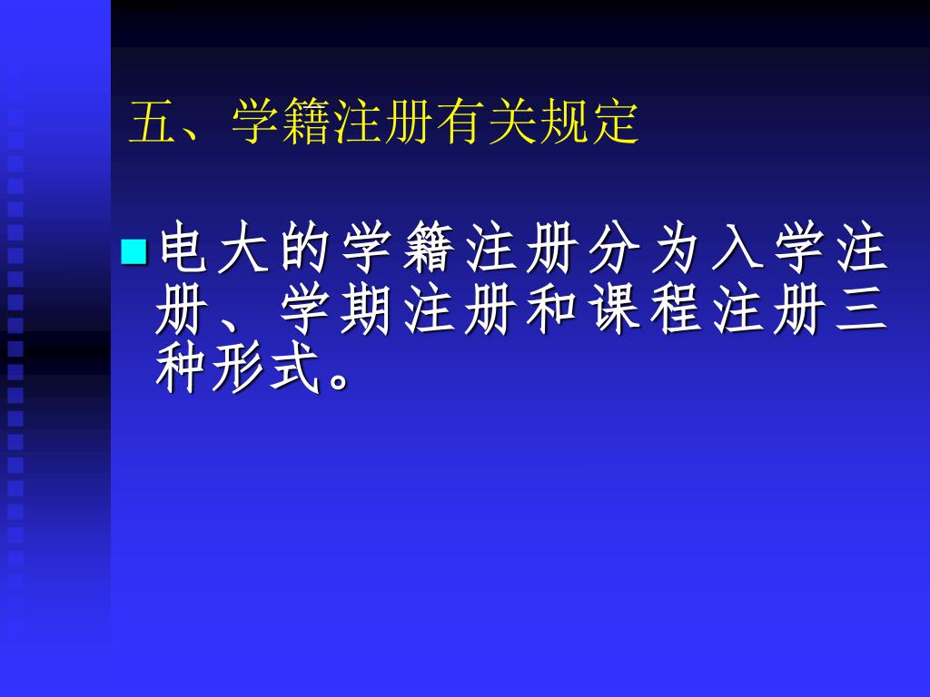 五、学籍注册有关规定 • 电大的学籍注册分为入学注册、学期注册和课程注册三种形式。