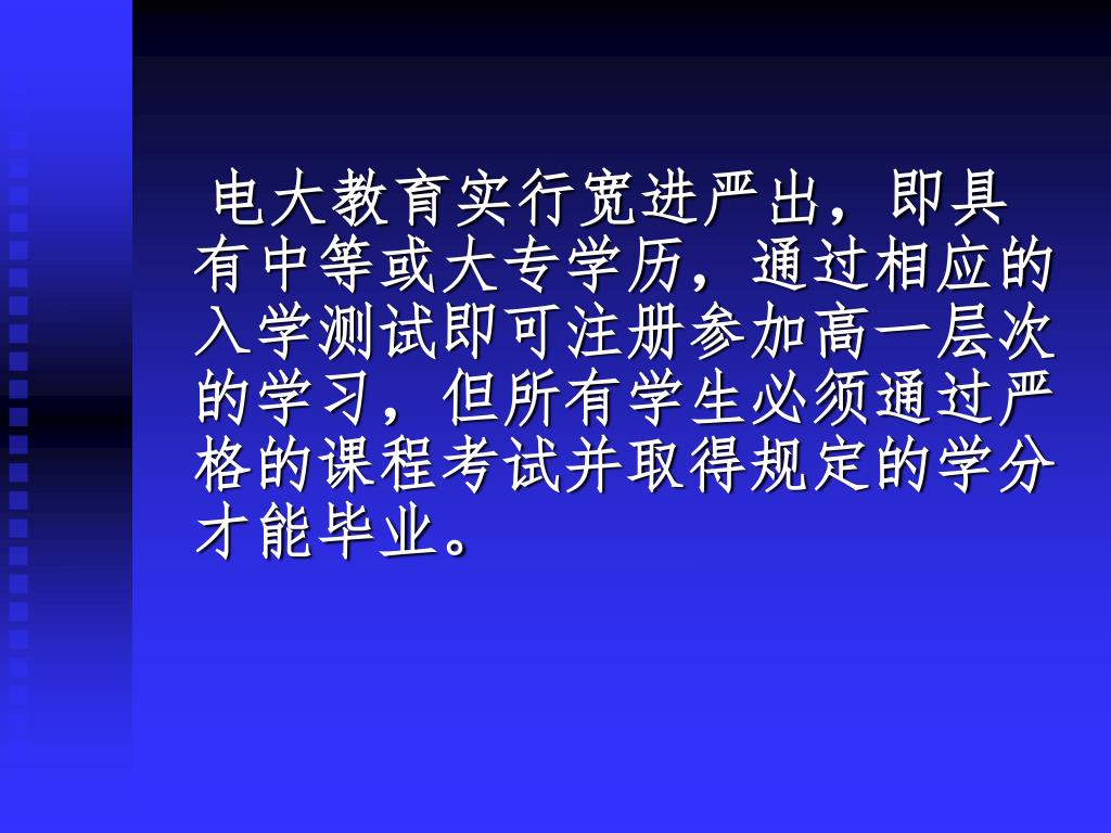 电大教育实行宽进严出,即具有中等或大专学历,通过相应的入学测试即可注册参加高一层次的学习,但所有学生必须通过严格的课程考试并取得规定的学分才能毕业。电大教育实行宽进严出,即具有中等或大专学历,通过相应的入学测试即可注册参加高一层次的学习,但所有学生必须通过严格的课程考试并取得规定的学分才能毕业。