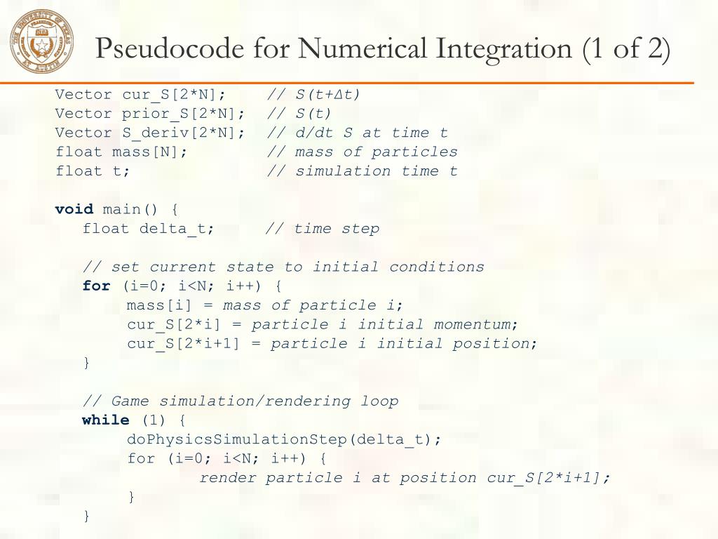 Pseudocodefor Numerical Integration (1 of 2) Vector cur_S[2*N]; // S(t+Δt) Vector prior_S[2*N]; // S(t) Vector S_deriv[2*N]; // d/dt S at time t float mass[N]; // mass of particles float t; // simulation time t void main() { float delta_t; // time step // set current state to initial conditions for (i=0; i<N; i++) { mass[i] = mass of particle i; cur_S[2*i] = particle i initial momentum; cur_S[2*i+1] = particle i initial position; } // Game simulation/rendering loop while (1) { doPhysicsSimulationStep(delta_t); for (i=0; i<N; i++) { render particle i at position cur_S[2*i+1]; } }