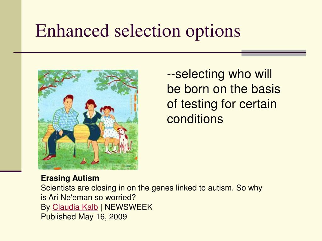 Enhanced selection options --selecting who will be born on the basis of testing for certain conditions Erasing Autism Scientists are closing in on the genes linked to autism. So why is Ari Ne'eman so worried? By Claudia Kalb | NEWSWEEK Published May 16, 2009