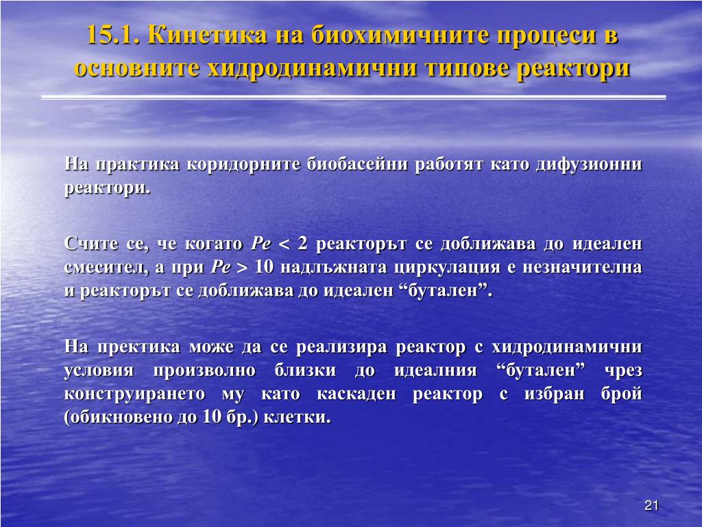 15.1. Кинетика на биохимичните процеси в основните хидродинамични типове реактори На практика коридорните биобасейни работят като дифузионни реактори. Счите се, че когато Ре < 2 реакторът се доближава до идеален смесител, а при Ре > 10 надлъжната циркулация е незначителна и реакторът се доближава до идеален “бутален”. На пректика може да се реализира реактор с хидродинамични условия произволно близки до идеалния “бутален” чрез конструирането му като каскаден реактор с избран брой (обикновено до 10 бр.) клетки.