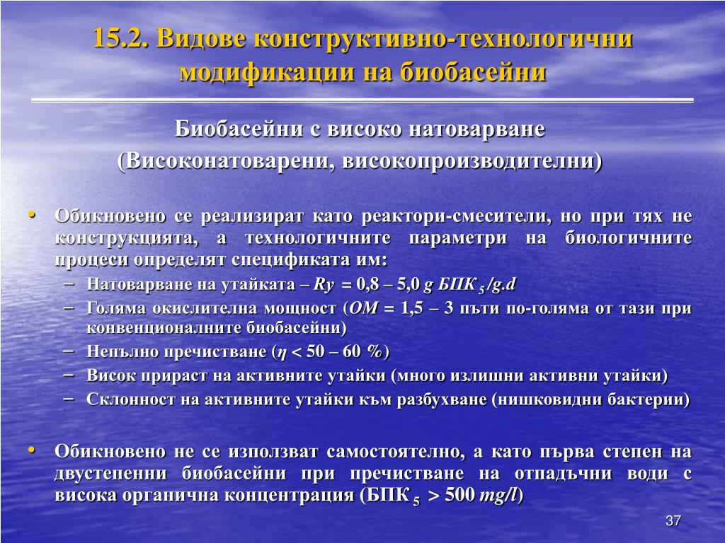15.2. Видовеконструктивно-технологични модификации на биобасейни Биобасейни с високо натоварване (Високонатоварени, високопроизводителни) • Обикновено се реализират като реактори-смесители, но при тях не конструкцията, а технологичните параметри на биологичните процеси определят спецификата им: • Натоварване на утайката – Rу = 0,8 – 5,0 g БПК 5 /g.d • Голяма окислителна мощност (ОМ = 1,5 – 3 пъти по-голяма от тази при конвенционалните биобасейни) • Непълно пречистване (η < 50 – 60 %) • Висок прираст на активните утайки (много излишни активни утайки) • Склонност на активните утайки към разбухване (нишковидни бактерии) • Обикновено не се използват самостоятелно, а като първа степен на двустепенни биобасейни при пречистване на отпадъчни води с висока органична концентрация (БПК 5 > 500 mg/l)