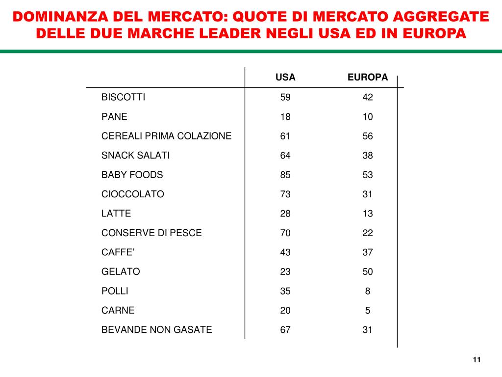 DOMINANZA DEL MERCATO: QUOTE DI MERCATO AGGREGATE DELLE DUE MARCHE LEADER NEGLI USA ED IN EUROPA 11