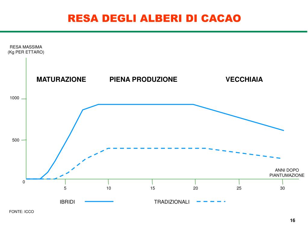 RESA DEGLI ALBERI DI CACAO RESA MASSIMA (Kg PER ETTARO) MATURAZIONE PIENA PRODUZIONE VECCHIAIA 1000 500 ANNI DOPO PIANTUMAZIONE 0 5 10 15 20 25 30 IBRIDI TRADIZIONALI FONTE: ICCO 16
