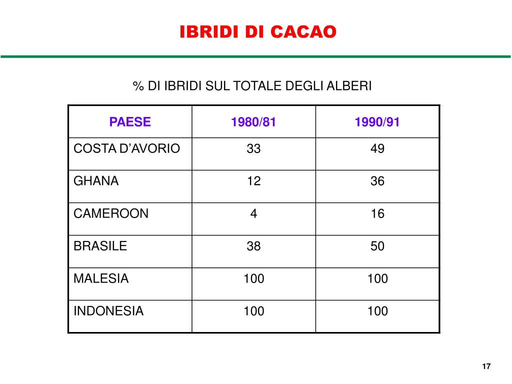 IBRIDI DI CACAO % DI IBRIDI SUL TOTALE DEGLI ALBERI 17