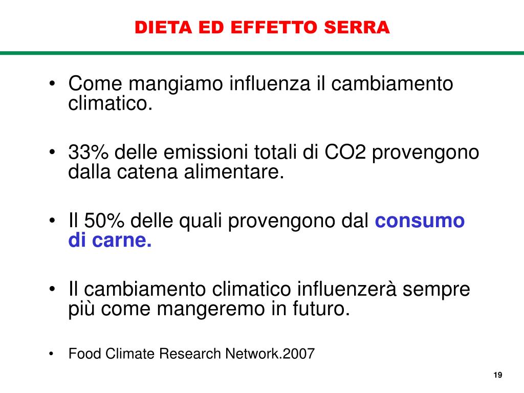DIETA ED EFFETTO SERRA • Come mangiamo influenza il cambiamento climatico. • 33% delle emissioni totali di CO2 provengono dalla catena alimentare. • Il 50% delle quali provengono dal consumo di carne. • Il cambiamento climatico influenzerà sempre più come mangeremo in futuro. • Food Climate Research Network.2007 19