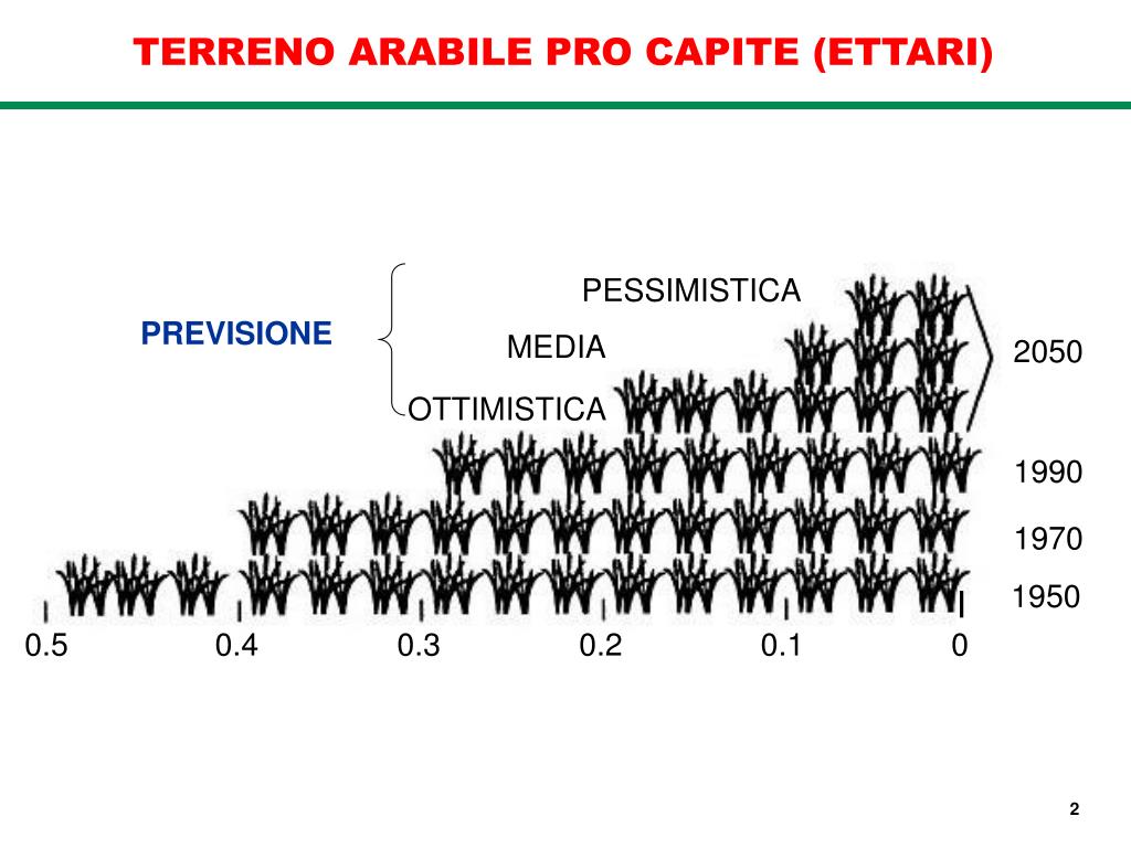 TERRENO ARABILE PRO CAPITE (ETTARI) PESSIMISTICA PREVISIONE MEDIA 2050 OTTIMISTICA 1990 1970 1950 0.5 0.4 0.3 0.2 0.1 0 2