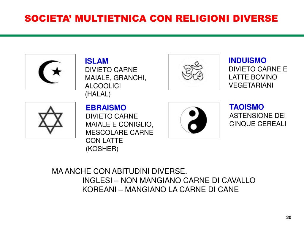 SOCIETA’ MULTIETNICA CON RELIGIONI DIVERSE INDUISMO DIVIETO CARNE E LATTE BOVINO VEGETARIANI ISLAM DIVIETO CARNE MAIALE, GRANCHI, ALCOOLICI (HALAL) TAOISMO ASTENSIONE DEI CINQUE CEREALI EBRAISMO DIVIETO CARNE MAIALE E CONIGLIO, MESCOLARE CARNE CON LATTE (KOSHER) MA ANCHE CON ABITUDINI DIVERSE. INGLESI – NON MANGIANO CARNE DI CAVALLO KOREANI – MANGIANO LA CARNE DI CANE 20