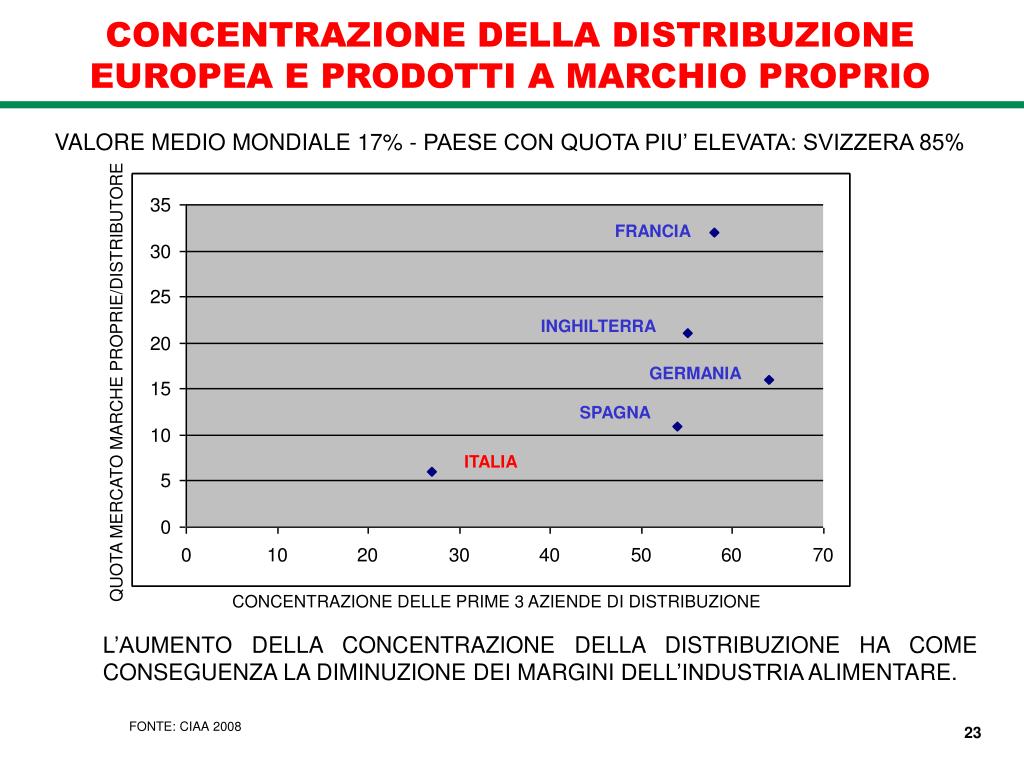FRANCIA INGHILTERRA GERMANIA SPAGNA ITALIA CONCENTRAZIONE DELLA DISTRIBUZIONE EUROPEA E PRODOTTI A MARCHIO PROPRIO VALORE MEDIO MONDIALE 17% - PAESE CON QUOTA PIU’ ELEVATA: SVIZZERA 85% QUOTA MERCATO MARCHE PROPRIE/DISTRIBUTORE CONCENTRAZIONE DELLE PRIME 3 AZIENDE DI DISTRIBUZIONE L’AUMENTO DELLA CONCENTRAZIONE DELLA DISTRIBUZIONE HA COME CONSEGUENZA LA DIMINUZIONE DEI MARGINI DELL’INDUSTRIA ALIMENTARE. 23 FONTE: CIAA 2008