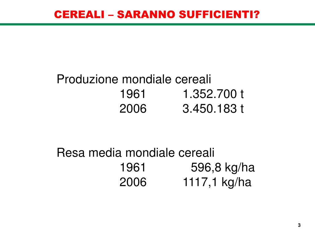 CEREALI – SARANNO SUFFICIENTI? Produzione mondiale cereali 1961 1.352.700 t 2006 3.450.183 t Resa media mondiale cereali 1961 596,8 kg/ha 2006 1117,1 kg/ha 3