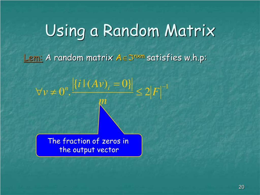 Using a Random Matrix Proof: (by the probabilistic method) Let v0nn. Because the inner product of v and a random vector is random: Hence, |{i : (vA)i = 0}| (denoted Xv) is a binomial random variable with parameters m and ||-1. For this random variable, we can compute the probability Pr[ Xv 2m||-1 ] (the probability that the fraction of zeros exceeds 2||-1 )