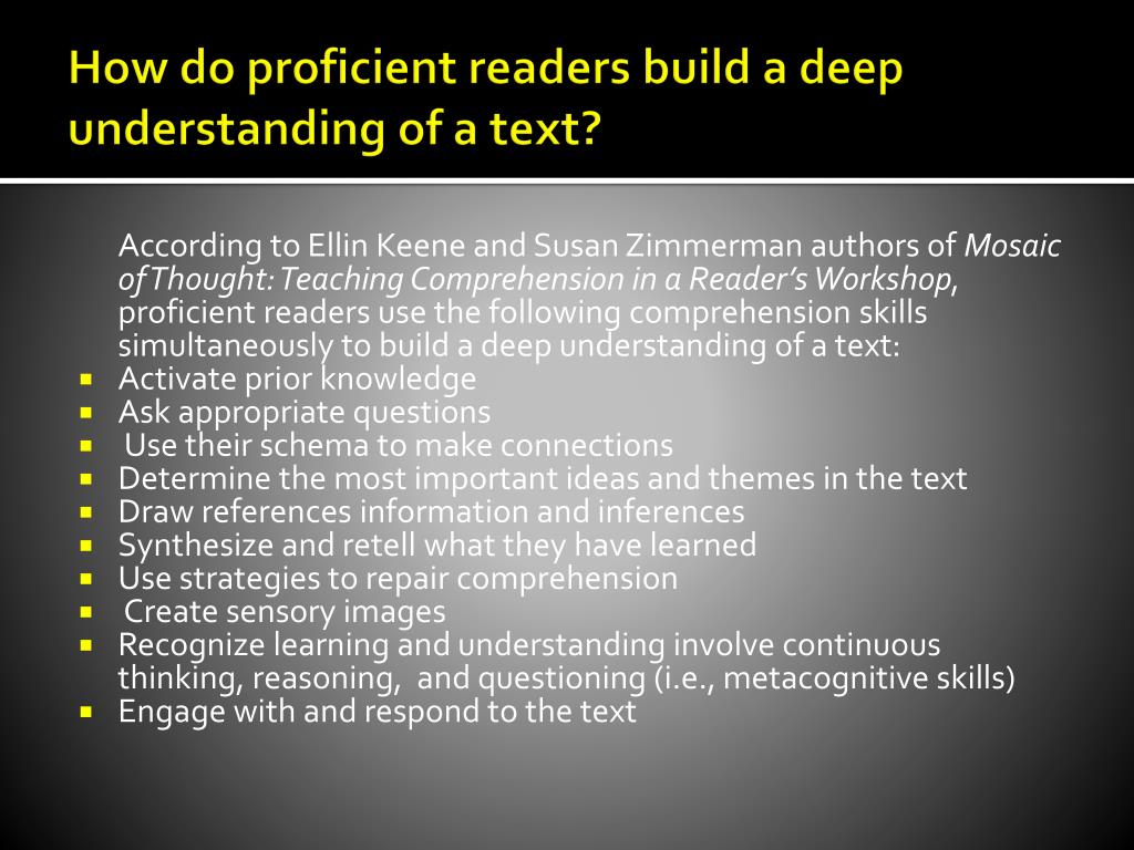 How do proficient readers build a deep understanding of a text? According to Ellin Keene and Susan Zimmerman authors of Mosaic of Thought: Teaching Comprehension in a Reader’s Workshop, proficient readers use the following comprehension skills simultaneously to build a deep understanding of a text: • Activate prior knowledge • Ask appropriate questions • Use their schema to make connections • Determine the most important ideas and themes in the text • Draw references information and inferences • Synthesize and retell what they have learned • Use strategies to repair comprehension • Create sensory images • Recognize learning and understanding involve continuous thinking, reasoning, and questioning (i.e., metacognitive skills) • Engage with and respond to the text