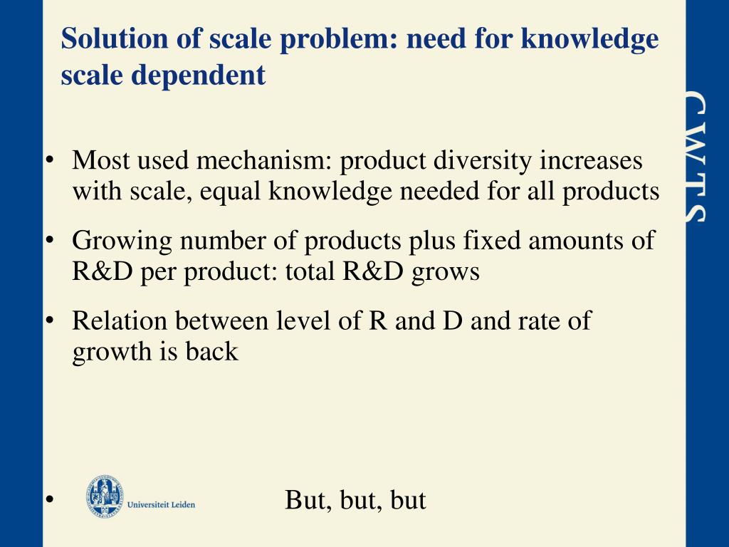 Solution of scale problem: need for knowledge scale dependent • Most used mechanism: product diversity increases with scale, equal knowledge needed for all products • Growing number of products plus fixed amounts of R&D per product total R&D grows • Relation between level of R and D and rate of growth is back • But, but, but