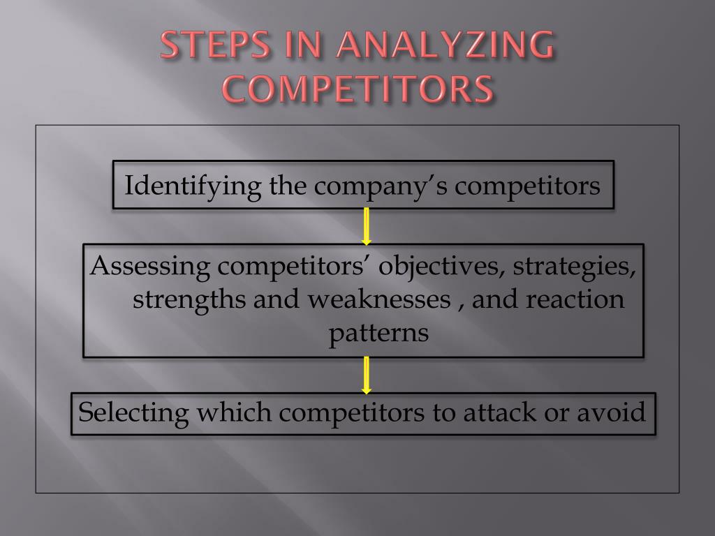 STEPS IN ANALYZING COMPETITORS Identifying the company’s competitors Assessing competitors’ objectives, strategies, strengths and weaknesses , and reaction patterns Selecting which competitors to attack or avoid