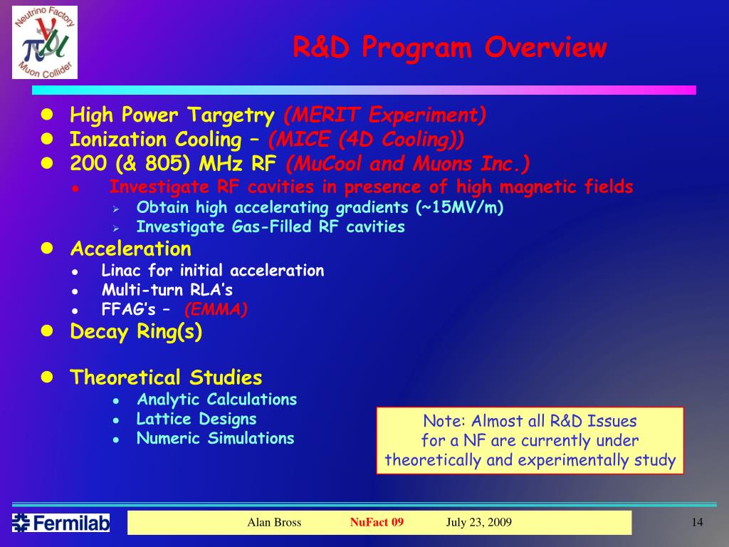 R&D Program Overview • High Power Targetry(MERIT Experiment) • Ionization Cooling – (MICE (4D Cooling)) • 200 (& 805) MHz RF (MuCool and Muons Inc.) • Investigate RF cavities in presence of high magnetic fields • Obtain high accelerating gradients (~15MV/m) • Investigate Gas-Filled RF cavities • Acceleration • Linac for initial acceleration • Multi-turn RLA’s • FFAG’s – (EMMA) • Decay Ring(s) • Theoretical Studies • Analytic Calculations • Lattice Designs • Numeric Simulations Note: Almost all R&D Issues for a NF are currently under theoretically and experimentally study