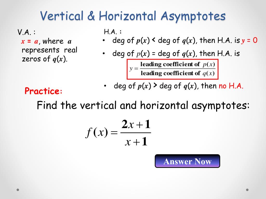 Vertical & Horizontal Asymptotes Answer Now • deg of p(x) < deg of q(x), then H.A. isy = 0 V.A. : x = a, where a represents real zeros of q(x). H.A. : • deg of p(x) = deg of q(x), then H.A. is • deg of p(x) > deg of q(x), then no H.A. Practice: Find the vertical and horizontal asymptotes: