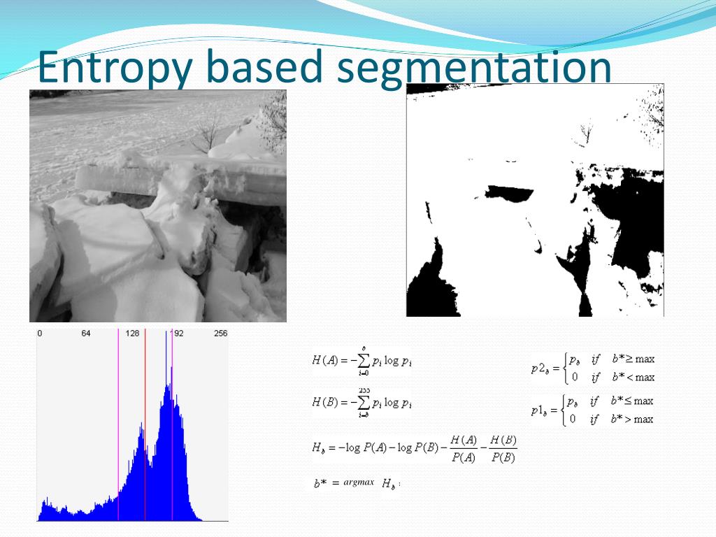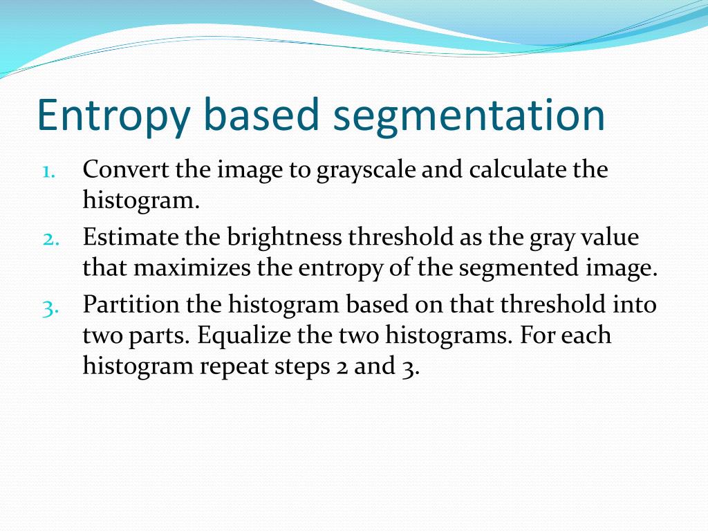 Entropy based segmentation • Convert the image to grayscale and calculate the histogram. • Estimate the brightness threshold as the gray value that maximizes the entropy of the segmented image. • Partition the histogram based on that threshold into two parts. Equalize the two histograms. For each histogram repeat steps 2 and 3.