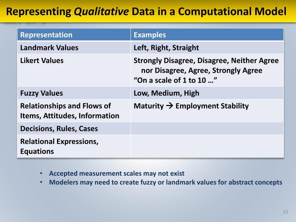 Representing Qualitative Data in a Computational Model • Accepted measurement scales may not exist • Modelers may need to create fuzzy or landmark values for abstract concepts