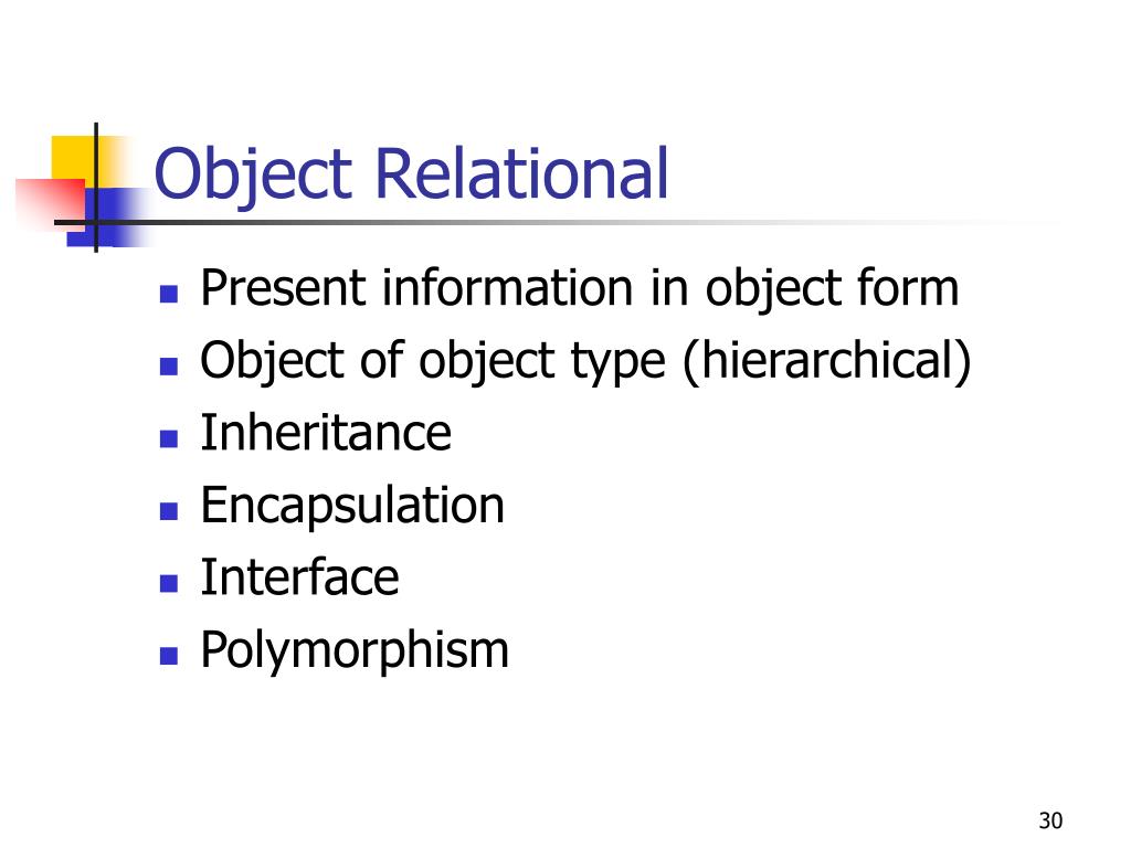 Object Relational • Present information in object form • Object of object type (hierarchical) • Inheritance • Encapsulation • Interface • Polymorphism