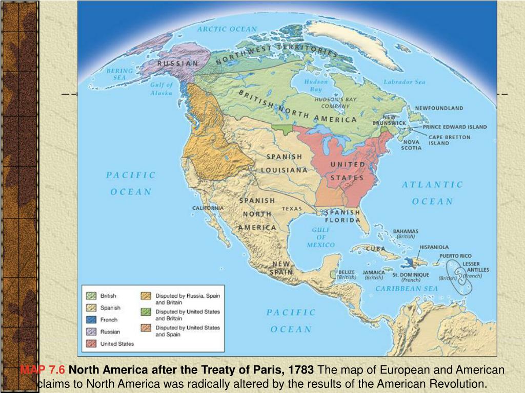MAP 7.6 North America after the Treaty of Paris, 1783 The map of European and American claims to North America was radically altered by the results of the American Revolution.
