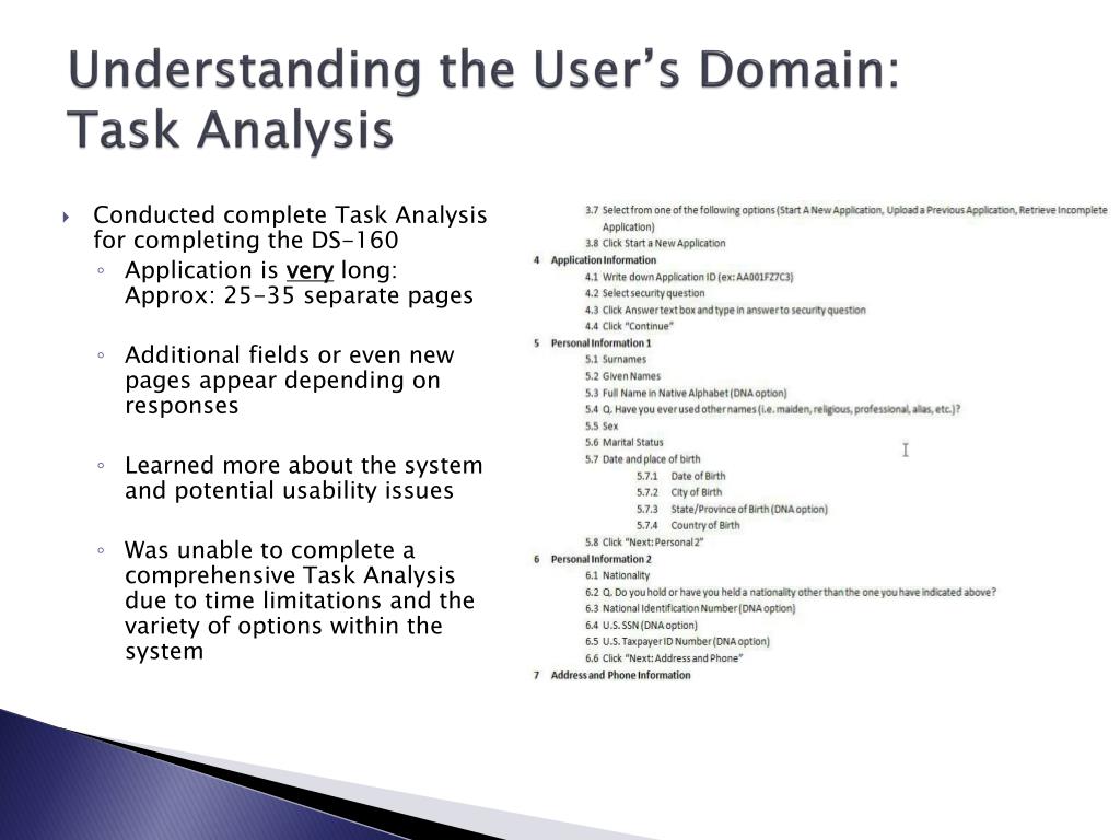 Understanding the User’s Domain: Task Analysis • Conducted complete Task Analysis for completing the DS-160 • Application is very long: Approx: 25-35 separate pages • Additional fields or even new pages appear depending on responses • Learned more about the system and potential usability issues • Was unable to complete a comprehensive Task Analysis due to time limitations and the variety of options within the system