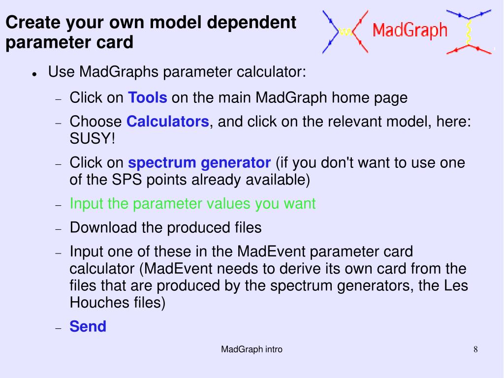 MadGraph intro Create your own model dependent parameter card Use MadGraphs parameter calculator: Click on Tools on the main MadGraph home page Choose Calculators, and click on the relevant model, here: SUSY! Click on spectrum generator (if you don't want to use one of the SPS points already available) Input the parameter values you want Download the produced files Input one of these in the MadEvent parameter card calculator (MadEvent needs to derive its own card from the files that are produced by the spectrum generators, the Les Houches files) Send