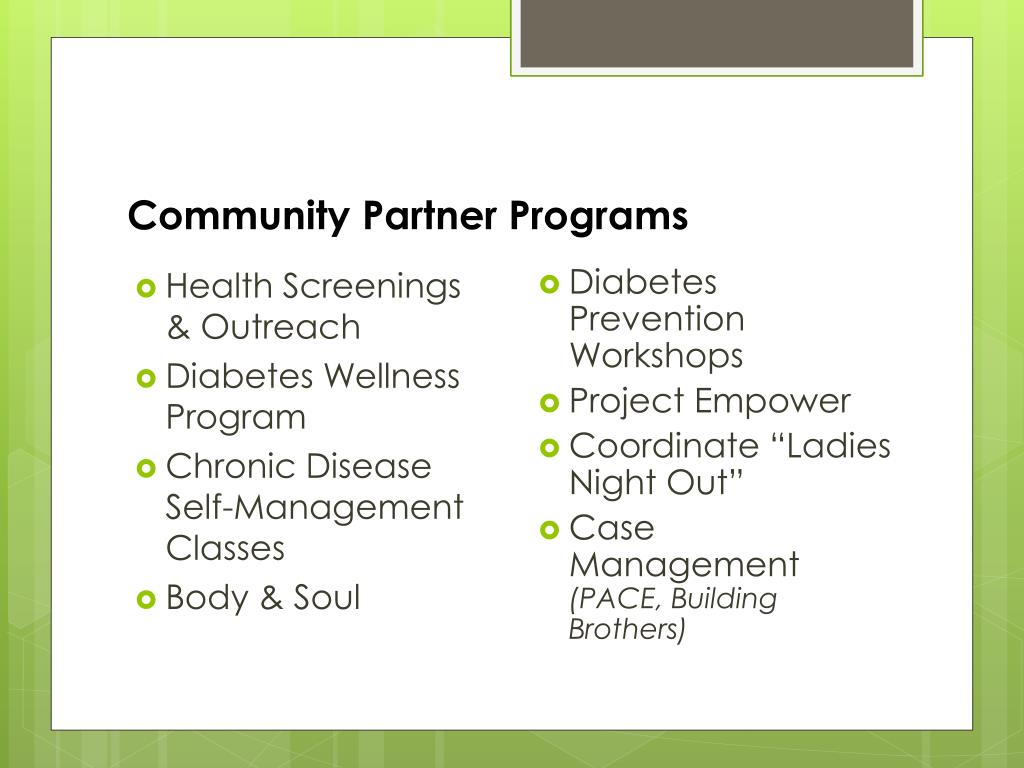 Community Partner Programs • Health Screenings & Outreach • Diabetes Wellness Program • Chronic Disease Self-Management Classes • Body & Soul • Diabetes Prevention Workshops • Project Empower • Coordinate “Ladies Night Out” • Case Management (PACE, Building Brothers)