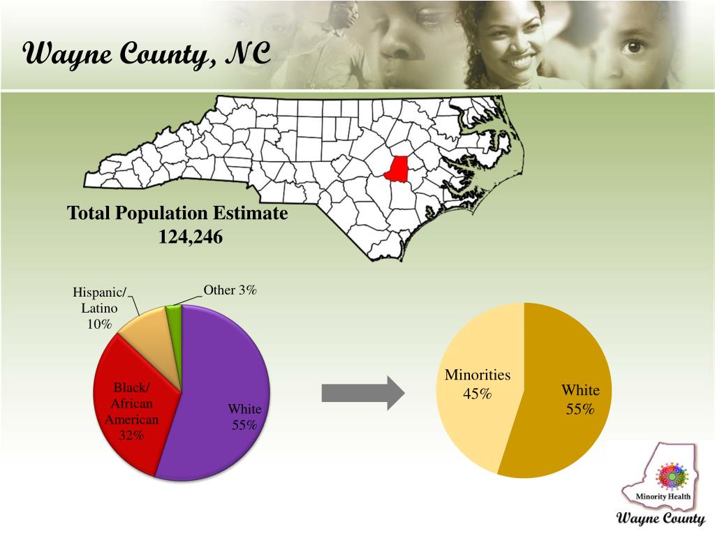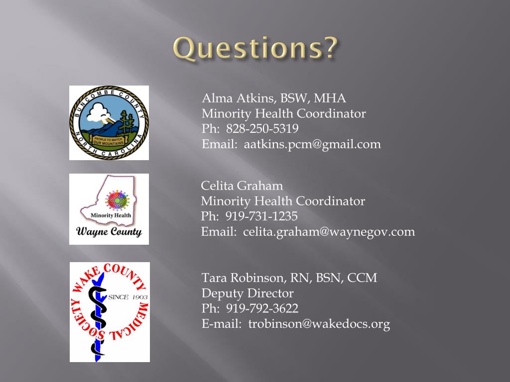 Questions? Alma Atkins, BSW, MHA Minority Health Coordinator Ph: 828-250-5319 Email: aatkins.pcm@gmail.com Celita Graham Minority Health Coordinator Ph: 919-731-1235 Email: celita.graham@waynegov.com Tara Robinson, RN, BSN, CCM Deputy Director Ph: 919-792-3622 E-mail: trobinson@wakedocs.org