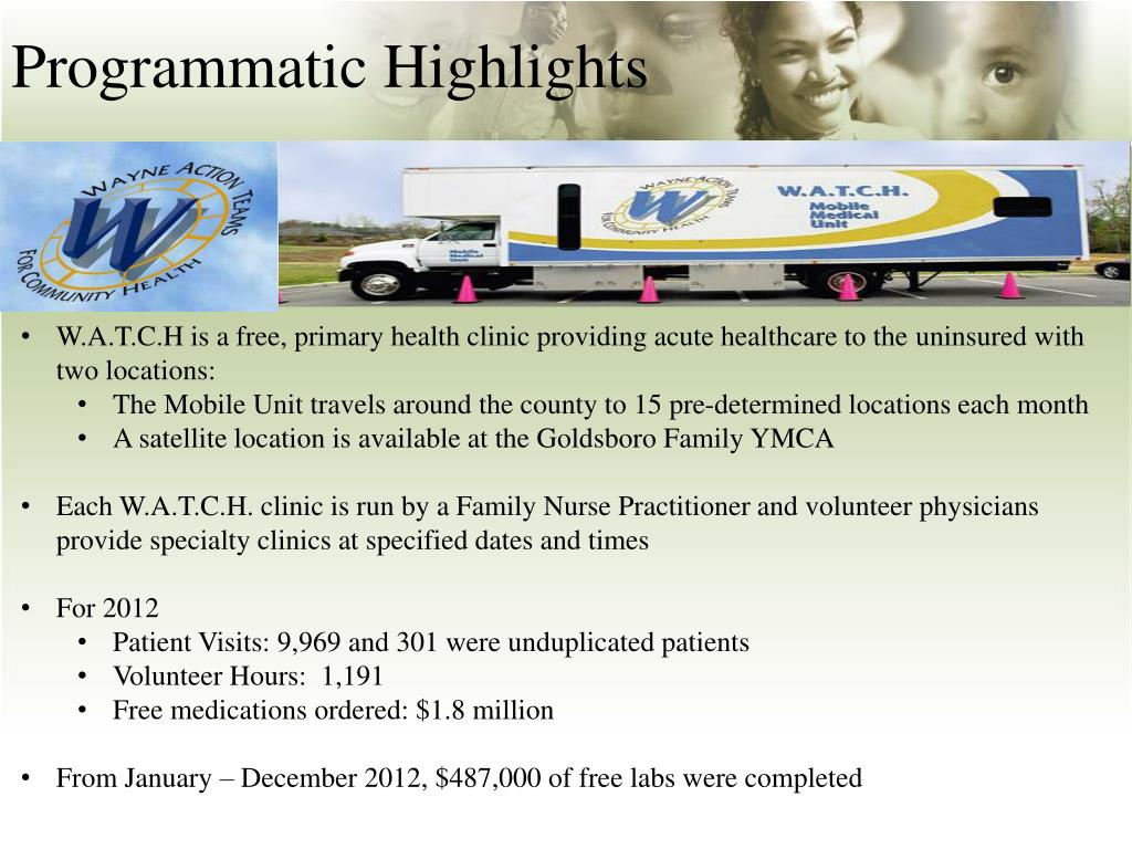 Programmatic Highlights • W.A.T.C.H is a free, primary health clinic providing acute healthcare to the uninsured with two locations: • The Mobile Unit travels around the county to 15 pre-determined locations each month • A satellite location is available at the Goldsboro Family YMCA • Each W.A.T.C.H. clinic is run by a Family Nurse Practitioner and volunteer physicians provide specialty clinics at specified dates and times • For 2012 • Patient Visits: 9,969 and 301 were unduplicated patients • Volunteer Hours: 1,191 • Free medications ordered: $1.8 million • From January – December 2012, $487,000 of free labs were completed