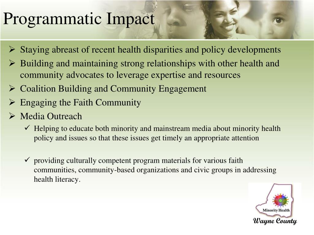 Programmatic Impact • Staying abreast of recent health disparities and policy developments • Building and maintaining strong relationships with other health and community advocates to leverage expertise and resources • Coalition Building and Community Engagement • Engaging the Faith Community • Media Outreach • Helping to educate both minority and mainstream media about minority health policy and issues so that these issues get timely an appropriate attention • providing culturally competent program materials for various faith communities, community-based organizations and civic groups in addressing health literacy.