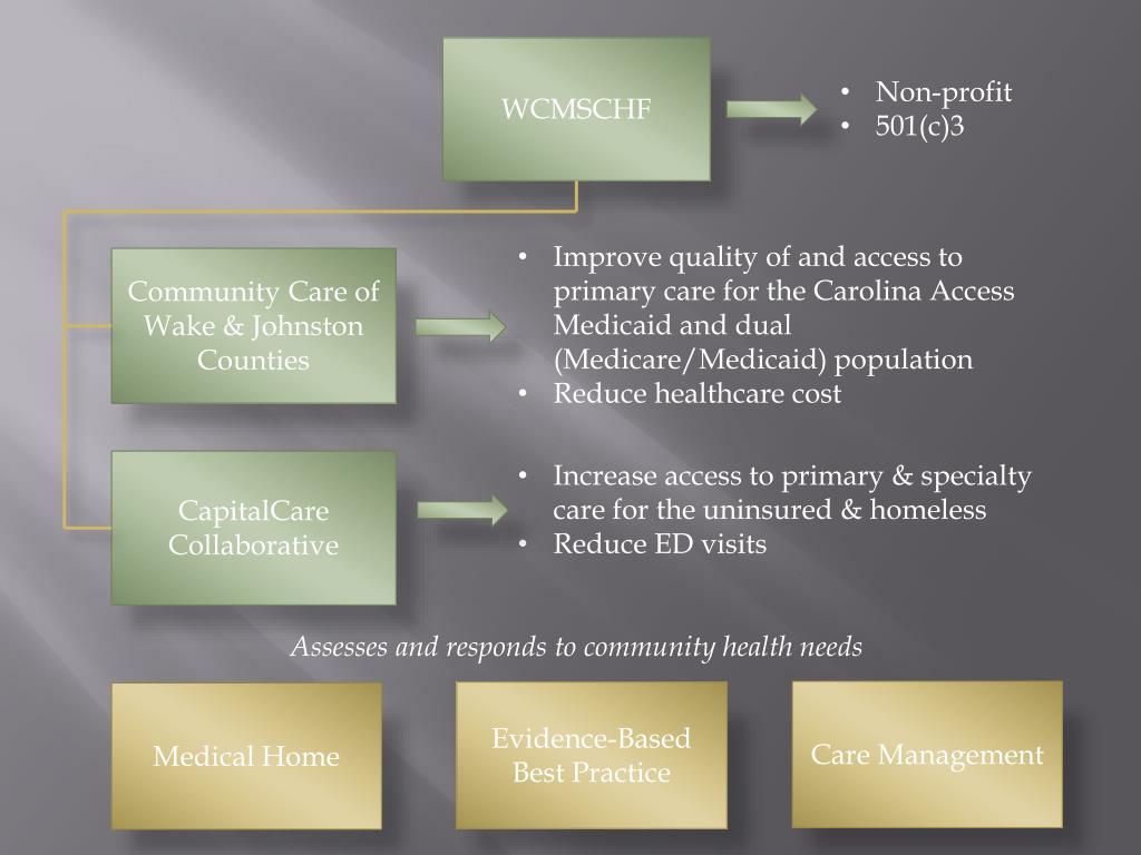 WCMSCHF • Non-profit • 501(c)3 • Improve quality of and access to primary care for the Carolina Access Medicaid and dual (Medicare/Medicaid) population • Reduce healthcare cost Community Care of Wake & Johnston Counties CapitalCare Collaborative • Increase access to primary & specialty care for the uninsured & homeless • Reduce ED visits • Assesses and responds to community health needs Care Management Evidence-Based Best Practice Medical Home
