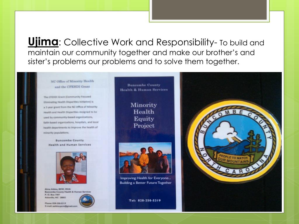 Ujima: Collective Work and Responsibility- To build and maintain our community together and make our brother’s and sister’s problems our problems and to solve them together.
