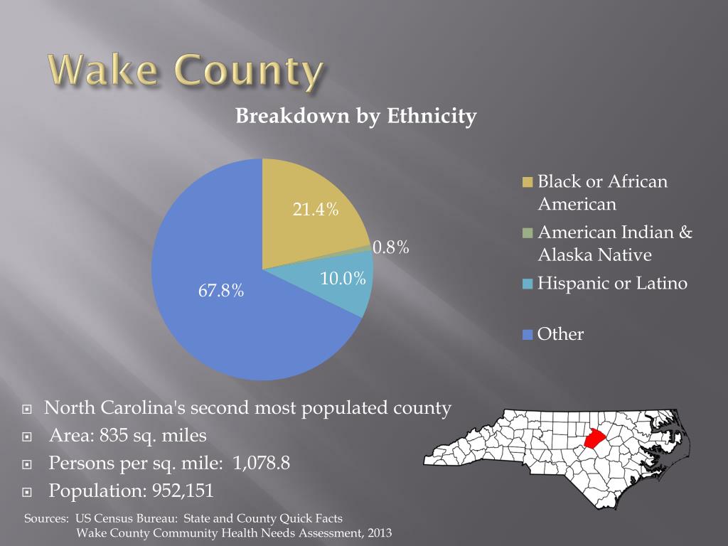 Wake County • North Carolina's second most populated county • Area: 835 sq. miles • Persons per sq. mile: 1,078.8 • Population: 952,151 Sources: US Census Bureau: State and County Quick Facts Wake County Community Health Needs Assessment, 2013