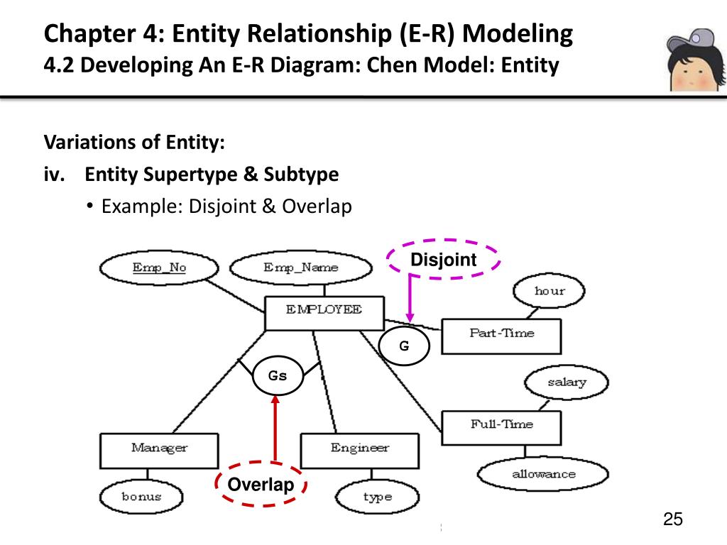 Chapter 4: Entity Relationship (E-R) Modeling4.2 Developing An E-R Diagram: Chen Model: Entity Disjoint G Gs Overlap Variations of Entity: • Entity Supertype & Subtype • Example: Disjoint & Overlap