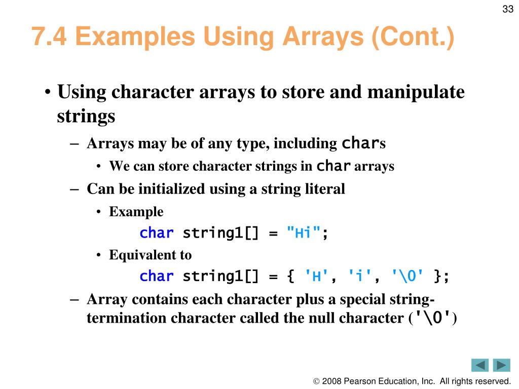 7.4 Examples Using Arrays (Cont.) • Using character arrays to store and manipulate strings • Arrays may be of any type, including chars • We can store character strings in char arrays • Can be initialized using a string literal • Example char string1[] = "Hi"; • Equivalent to char string1[] = { 'H', 'i', '\0' }; • Array contains each character plus a special string-termination character called the null character ('\0')
