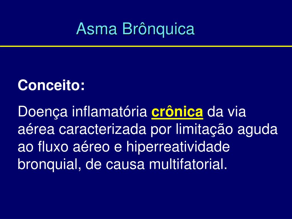 Asma Brônquica • Conceito: • Doença inflamatória crônica da via aérea caracterizada por limitação aguda ao fluxo aéreo e hiperreatividade bronquial, de causa multifatorial.