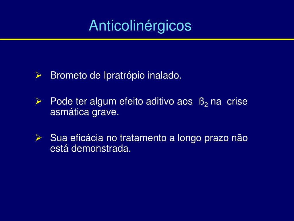 Anticolinérgicos • Brometo de Ipratrópio inalado. • Pode ter algum efeito aditivo aos ß2 na crise asmática grave. • Sua eficácia no tratamento a longo prazo não está demonstrada.