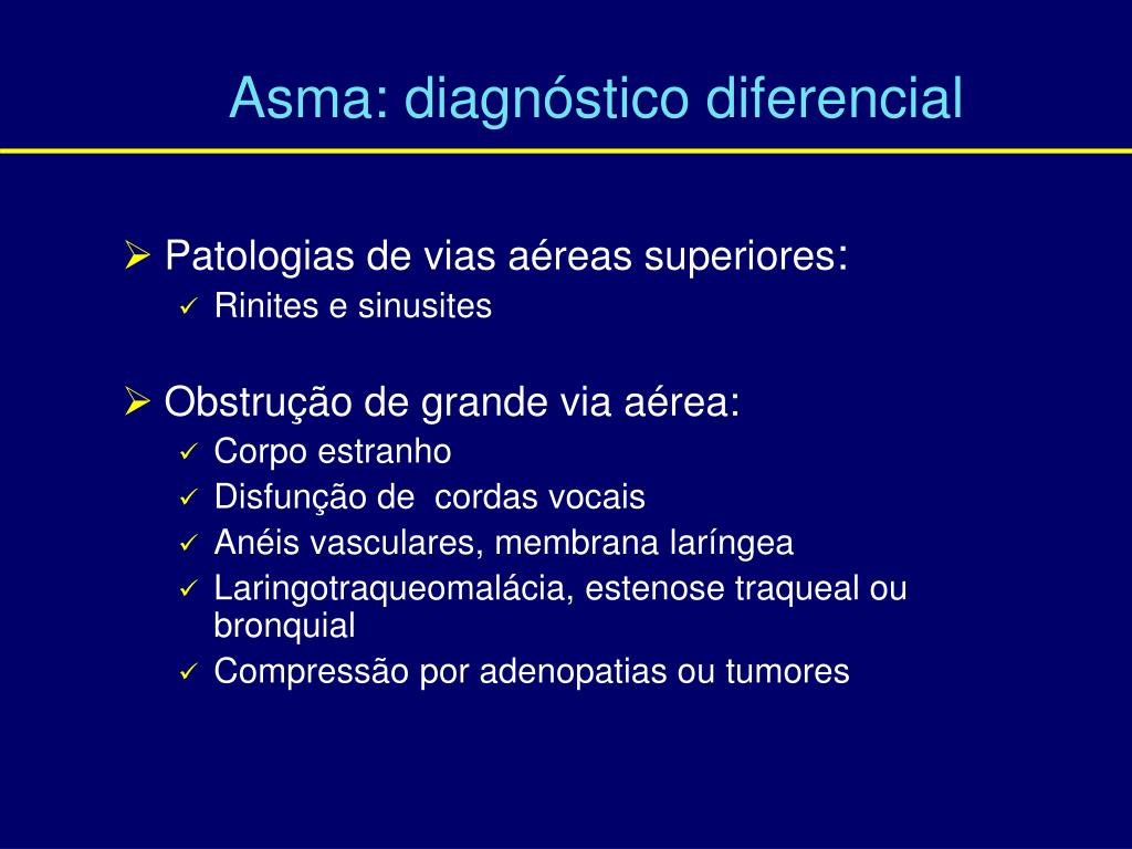Asma: diagnóstico diferencial • Patologias de vias aéreas superiores: • Rinites e sinusites • Obstrução de grande via aérea: • Corpo estranho • Disfunção de cordas vocais • Anéis vasculares, membrana laríngea • Laringotraqueomalácia, estenose traqueal ou bronquial • Compressão por adenopatias ou tumores