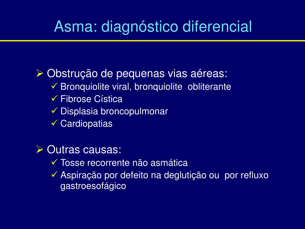 Asma: diagnóstico diferencial • Obstrução de pequenas vias aéreas: • Bronquiolite viral, bronquiolite obliterante • Fibrose Cística • Displasia broncopulmonar • Cardiopatias • Outras causas: • Tosse recorrente não asmática • Aspiração por defeito na deglutição ou por refluxo gastroesofágico.