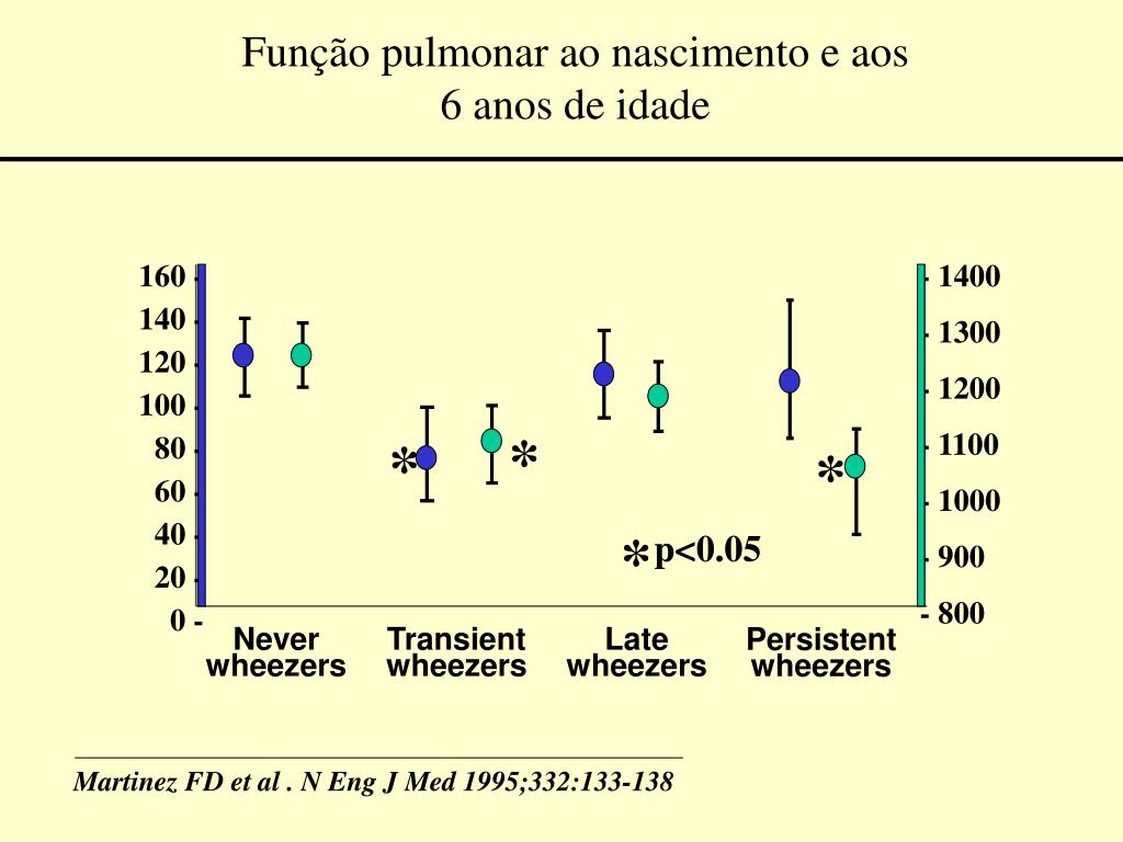 - 1400 - 1300 - 1200 - 1100 - 1000 - 900 - 800 160 - 140 - 120 - 100 - 80 - 60 - 40 - 20 - 0 - * * * * p<0.05 Never wheezers Transient wheezers Late wheezers Persistent wheezers Função pulmonar ao nascimento e aos 6 anos de idade Martinez FD et al . N Eng J Med 1995;332:133-138