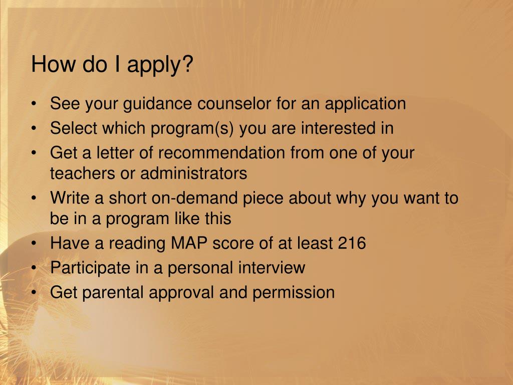 How do I apply? • See your guidance counselor for an application • Select which program(s) you are interested in • Get a letter of recommendation from one of your teachers or administrators • Write a short on-demand piece about why you want to be in a program like this • Have a reading MAP score of at least 216 • Participate in a personal interview • Get parental approval and permission