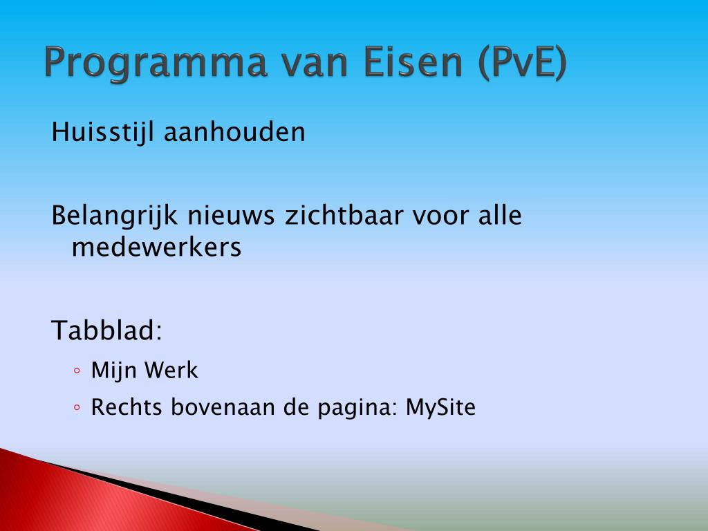 Programma van Eisen (PvE) Huisstijlaanhouden Belangrijk nieuws zichtbaar voor alle medewerkers Tabblad: • MijnWerk • Rechts bovenaan de pagina: MySite