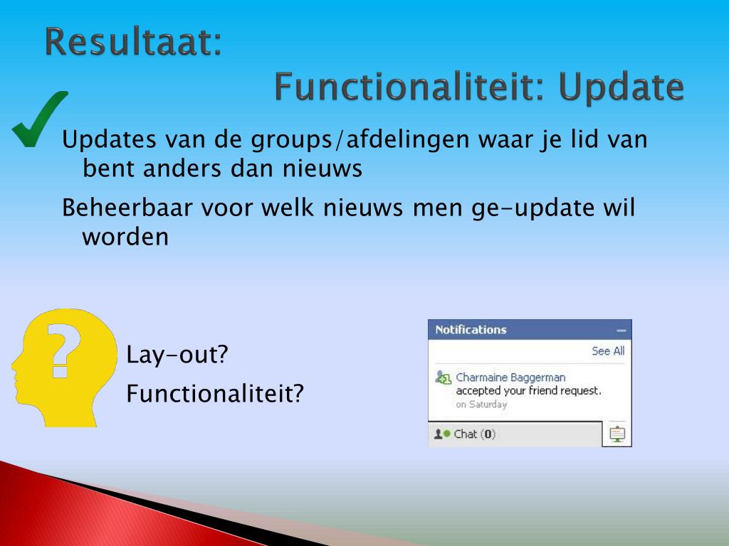 Resultaat: Functionaliteit: Update Updates van de groups/afdelingenwaar je lid van bent andersdannieuws Beheerbaarvoorwelknieuws men ge-update wilworden Lay-out? Functionaliteit?