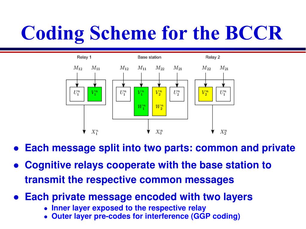 Coding Scheme for the BCCR Each message split into two parts: common and private Cognitive relays cooperate with the base station to transmit the respective common messages Each private message encoded with two layers Inner layer exposed to the respective relay Outer layer pre-codes for interference (GGP coding)