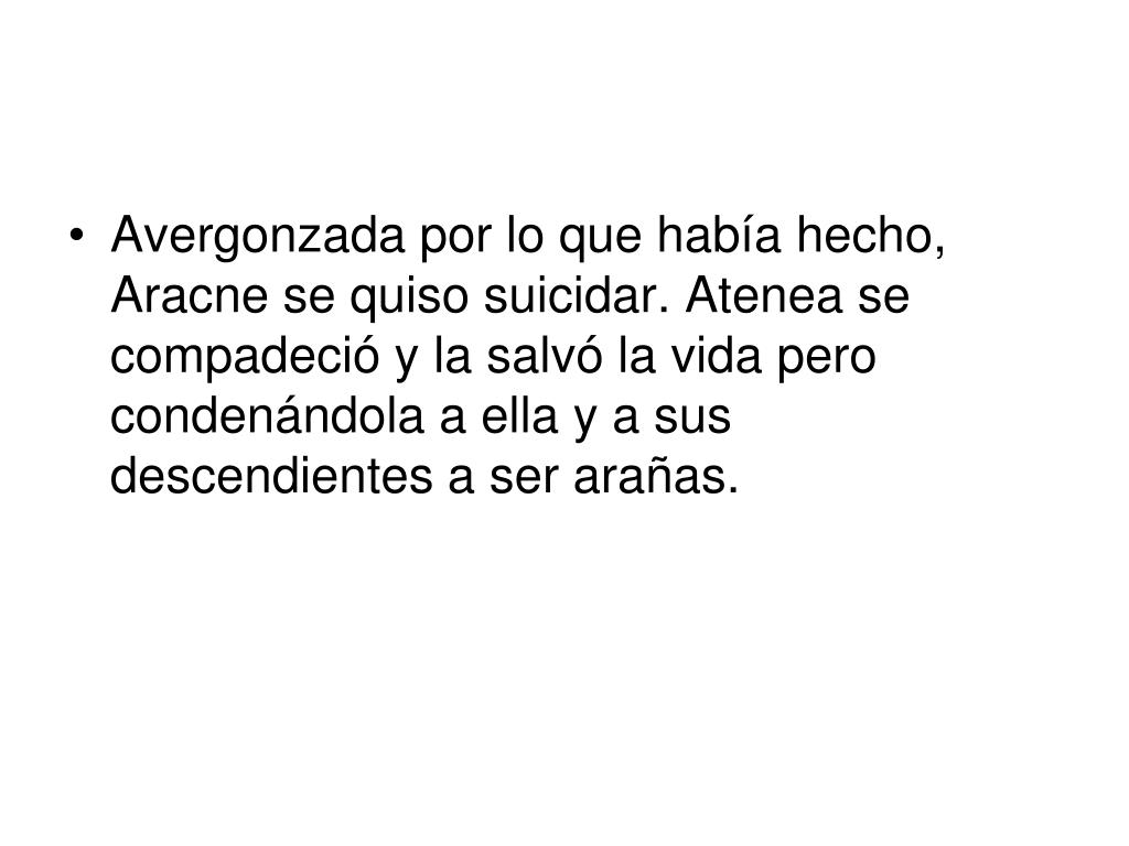 Avergonzada por lo que había hecho, Aracne se quiso suicidar. Atenea se compadeció y la salvó la vida pero condenándola a ella y a sus descendientes a ser arañas.