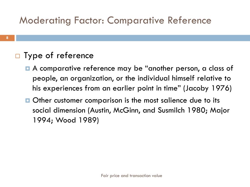 Moderating Factor: Comparative Reference • Type of reference • A comparative reference may be “another person, a class of people, an organization, or the individual himself relative to his experiences from an earlier point in time” (Jacoby 1976) • Other customer comparison is the most salience due to its social dimension (Austin, McGinn, and Susmilch 1980; Major 1994; Wood 1989) Fair price and transaction value